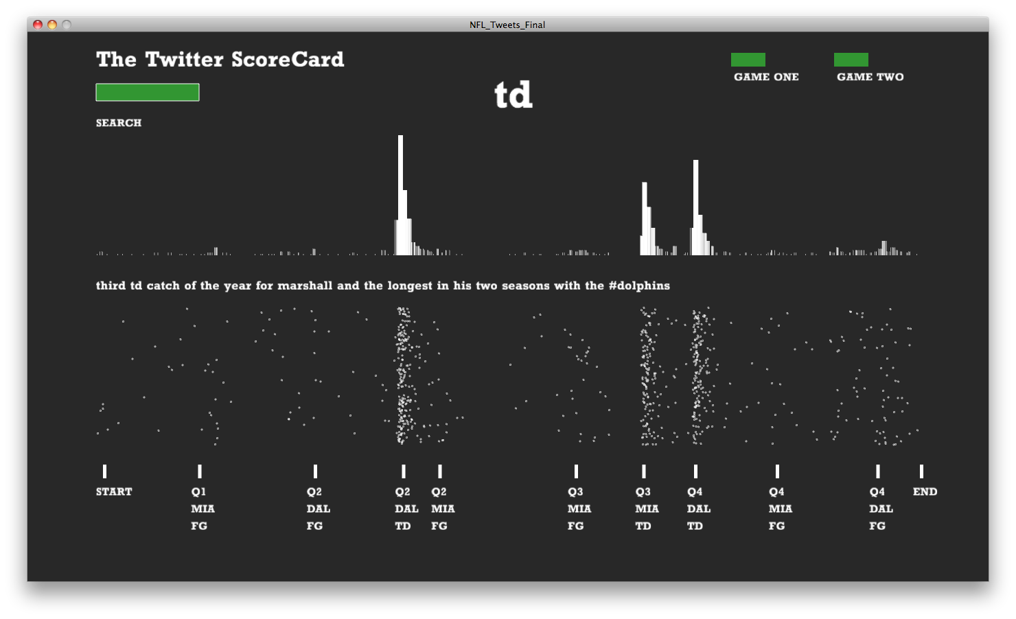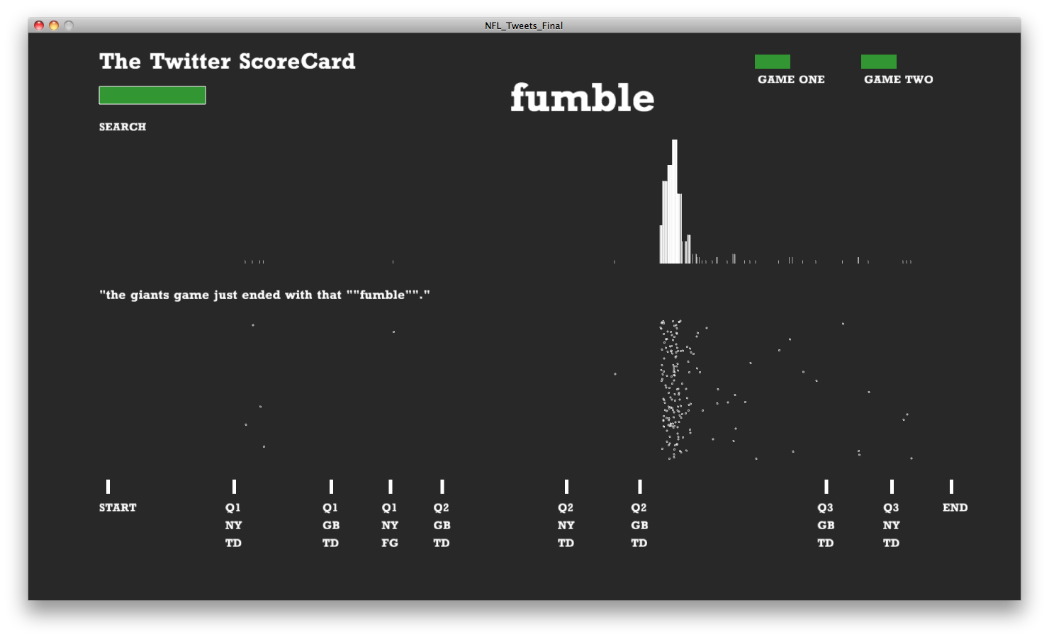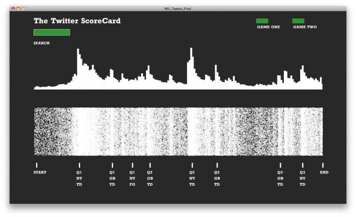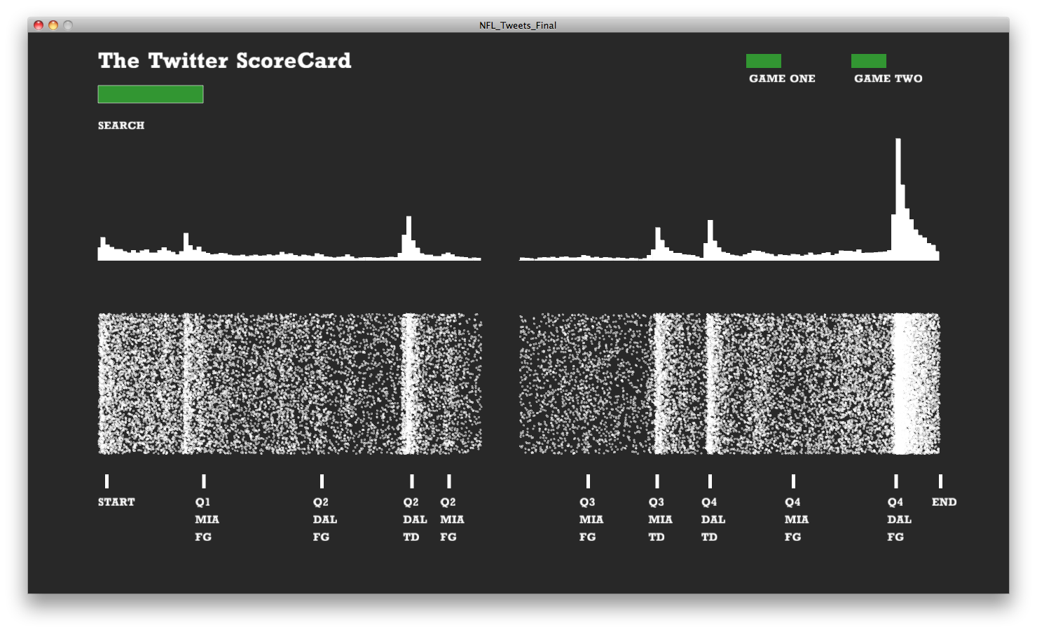 Using Twitter's real-time Streaming API, tweets with specific hashtags and key words were collected for two NFL games. The tweets were then presented in a searchable timeline fashion using Processing. Please see this Archived Blog Post for a full project description